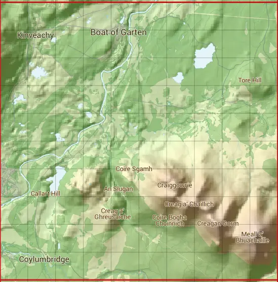 The NH91 10 square kilometre grid intersects with the settlements of Aviemore,Boat of Garten,Coylumbridge & Inverdruie.