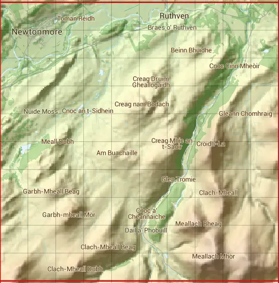 The NN79 10 square kilometre grid intersects with the settlement of Newtonmore.