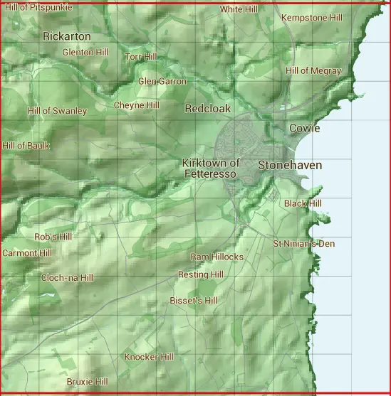 The NO88 10 square kilometre grid intersects with the settlements of Glithno,Kirktown of Fetteresso,Redcloak & Stonehaven.