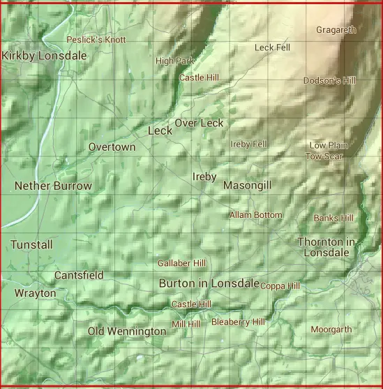 The SD67 10 square kilometre grid intersects with the settlements of Burton in Lonsdale,Casterton,High Bentham,Ingleton,Ireby,Kearstwick,Kirkby Lonsdale,Leck,Low Biggins,Melling,Nether Burrow,Tunstall,Wennington & Whittington.