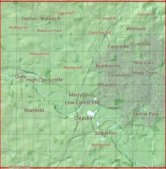 The NZ21 10 square kilometre grid intersects with the settlements of Aldbrough St John,Beaumont Hill,Carlbury,Cleasby,Cliffe,Coatham Mundeville,Croft-on-Tees,Darlington,Denton,High Coniscliffe,Hurworth-on-Tees,Low Coniscliffe,Manfield,Merrybent,Piercebridge,Stapleton,Summerhouse & Whessoe.