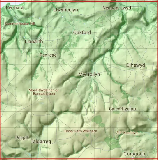 The SN45 10 square kilometre grid intersects with the settlements of Ciliau Aeron,Dihewyd,Gilfachreda,Gorsgoch,Llanarth,Llwyncelyn,Mydroilyn,New Quay,Post-Mawr / Synod Inn & Talgarreg.