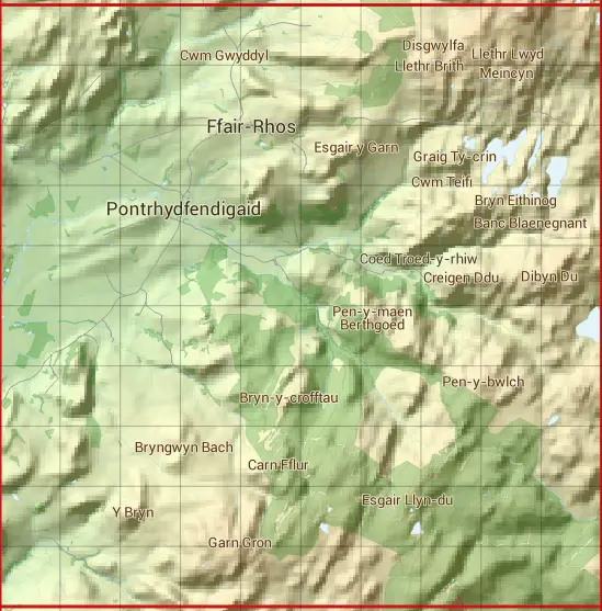 The SN76 10 square kilometre grid intersects with the settlements of Ffair-Rhos & Pontrhydfendigaid.
