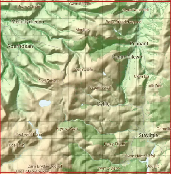The SN89 10 square kilometre grid intersects with the settlement of Bont Dolgadfan.