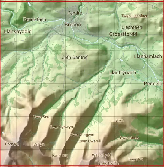 The SO02 10 square kilometre grid intersects with the settlements of Aberhonddu,Groesffordd,Llanfrynach & Llanspyddid.