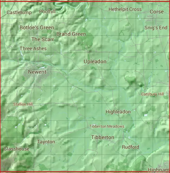 The SO72 10 square kilometre grid intersects with the settlements of Botloe's Green,Clifford's Mesne,Corse,Dursley Cross,Glasshouse,Hartpury,Hethelpit Cross,Highleadon,Highnam,Kilcot,Littleford,May Hill Village,Newent,Oxenhall,Taynton,The Scarr,Tibberton,Upleadon & Woolridge.
