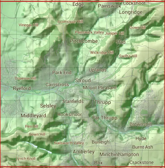 The SO80 10 square kilometre grid intersects with the settlements of Amberley,Bagpath,Bownham,Box,Brimscombe,Butterrow,Chalford,Eastcombe,Edge,Far Thrupp,France Lynch,Haresfield,Houndscroft,King's Stanley,Knave-in-hole,Leonard Stanley,Littleworth,Middleyard,Minchinhampton,Nailsworth,Nympsfield,Painswick,Pitchcombe,Randwick,Ruscombe,Ryeford,Selsley,Selsley West,Sheepscombe,Slad,St Chloe,Stancombe,Stanley Downton,Stonehouse,Stroud,Stroud Green,Theescombe,Thrupp,Whiteshill & Woodchester.