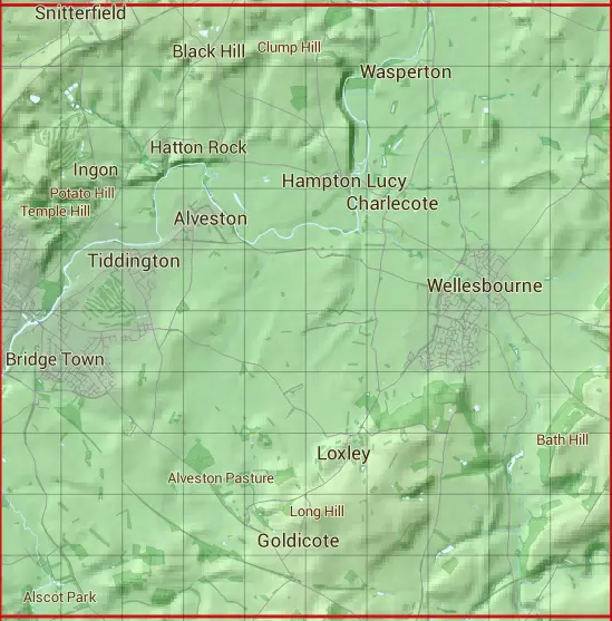 The SP25 10 square kilometre grid intersects with the settlements of Alveston,Atherstone on Stour,Barford,Black Hill,Charlecote,Goldicote,Hampton Lucy,Loxley,Snitterfield,Stratford-upon-Avon,Tiddington,Wasperton & Wellesbourne.