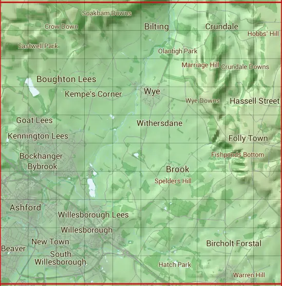The TR04 10 square kilometre grid intersects with the settlements of Ashford,Bilting,Bircholt Forstal,Boughton Aluph,Boughton Corner,Boughton Lees,Brabourne,Brabourne Lees,Brook,Crundale,Folly Town,Hassell Street,Hastingleigh,Hinxhill,Kempe's Corner,Mersham,Naccolt,Potters Corner,Ridgeway,Sevington,Smeeth,Sole Street & Wye.